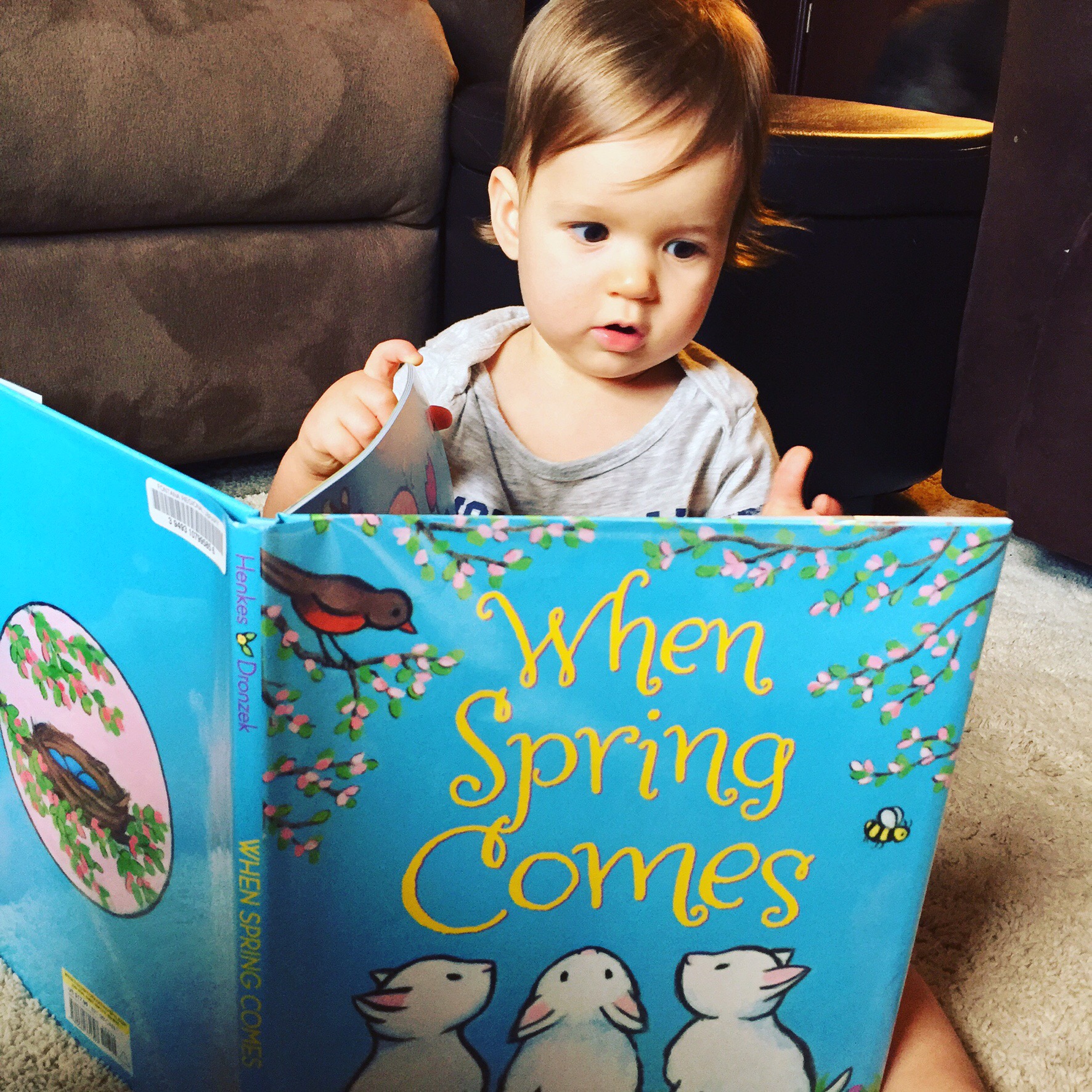 Summer Reading Day 60: Our book today was When Spring Comes, written by Kevin Henkes and illustrated by Lauren Dronzek. As you might guess from the title, this is a book about the beginnings of spring: flowers, rain, new kittens, etc. It’s a fairly thorough examination of the spring season, told through a simple, lovely narrative and with some colorful and sweet illustrations. The length was perfect for JJ, and she loved the pictures. Definitely a good one to pick up around springtime! Baby bookworm approved.