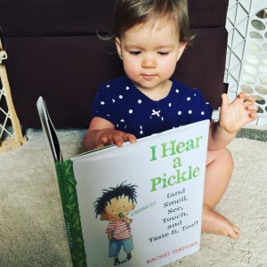 Hello everyone! Our book today is I Hear A Pickle (And Smell, See, Touch And Taste It, Too!) by Rachel Isadora. This is a fun book about the five senses that goes over what you can and can’t taste, see, touch, hear and smell, a pickle being something you can enjoy with all five!