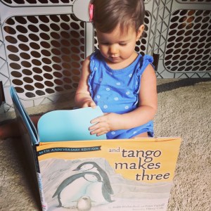 So what was our opinion? This is a lovely story about family, and how it doesn’t always have to look traditional to be warm and loving, and an informative book on how penguins find mates and raise families. The illustrations are darling, and JJ loved them. It was a bit long for a one-year-old, but she did okay with it, so older children would definitely love it. Baby Bookworm approved!