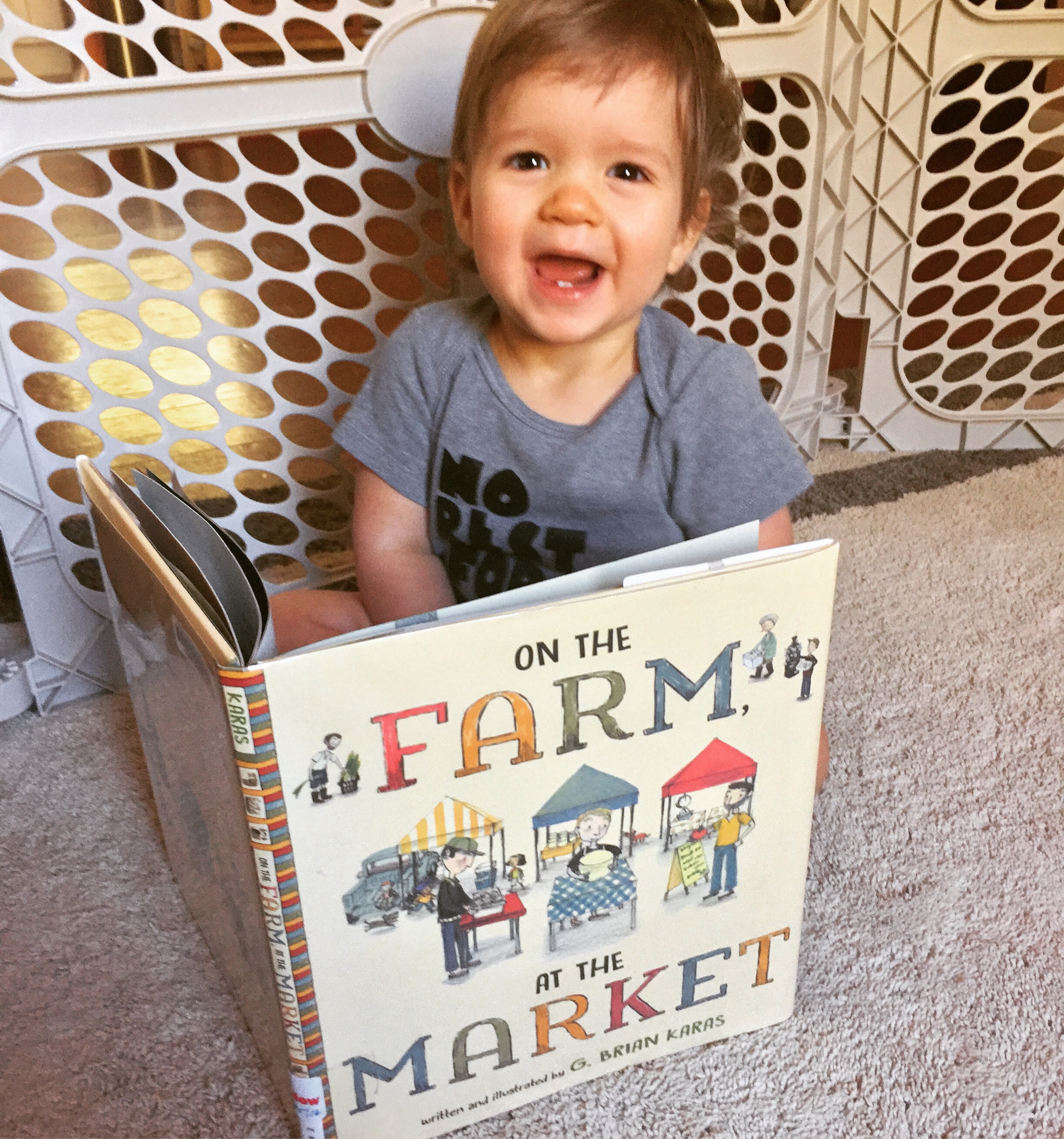 Hello, everybody! Our book today is On The Farm, At The Market by G. Brian Karas, a very cool book that shows how some of our favorite foods come from small farms to our local farmer’s markets!