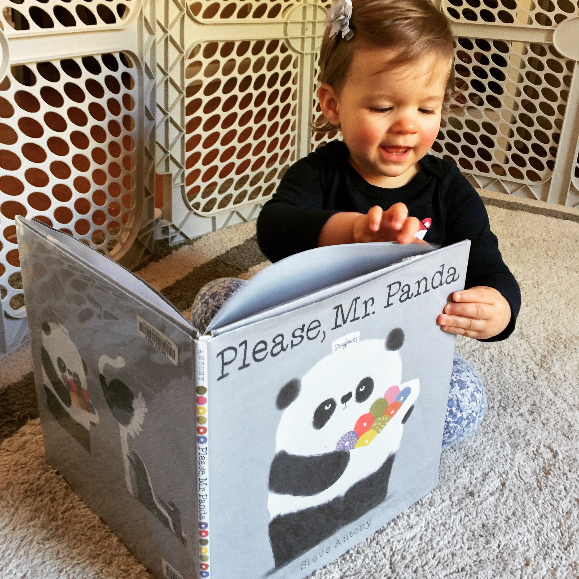 Hello, friends! If JJ seems a little more rosy-cheeked than usual, it’s because she woke up with a cold! Poor baby. Still, we were able to get our reading in today: we read Please, Mr. Panda by Steve Antony, a short and sweet tale about the importance of the magic word.