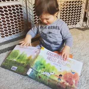 Hello, all! Welcome to our Fall Festivities Week! From today through Thursday, we will be reading books that celebrate the change of seasons: fall colors, autumn holidays and, of course, Thanksgiving. To start us off, our book today is Goodbye Summer, Hello Autumn by Kenard Pak, an exploration of the different elements of nature that change as the seasons do.