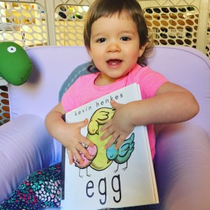 This was a simple, fun little book about eggs, patience, and friendship, and we had a lot of fun with it. It’s especially great for very young readers because the text is minimal and repetitive: by the third “peck-peck-peck” panel, JJ was tapping the book and “ek”-ing along with me. The spring-themed color scheme is bright, simple, and visually pleasing, and Henke’s illustrations are as sweet and charming as always. The length is just perfect for babies, and as you can tell from the photo, JJ absolutely loved it! This is an easy and fun springtime read, and we recommend it. Baby Bookworm approved!