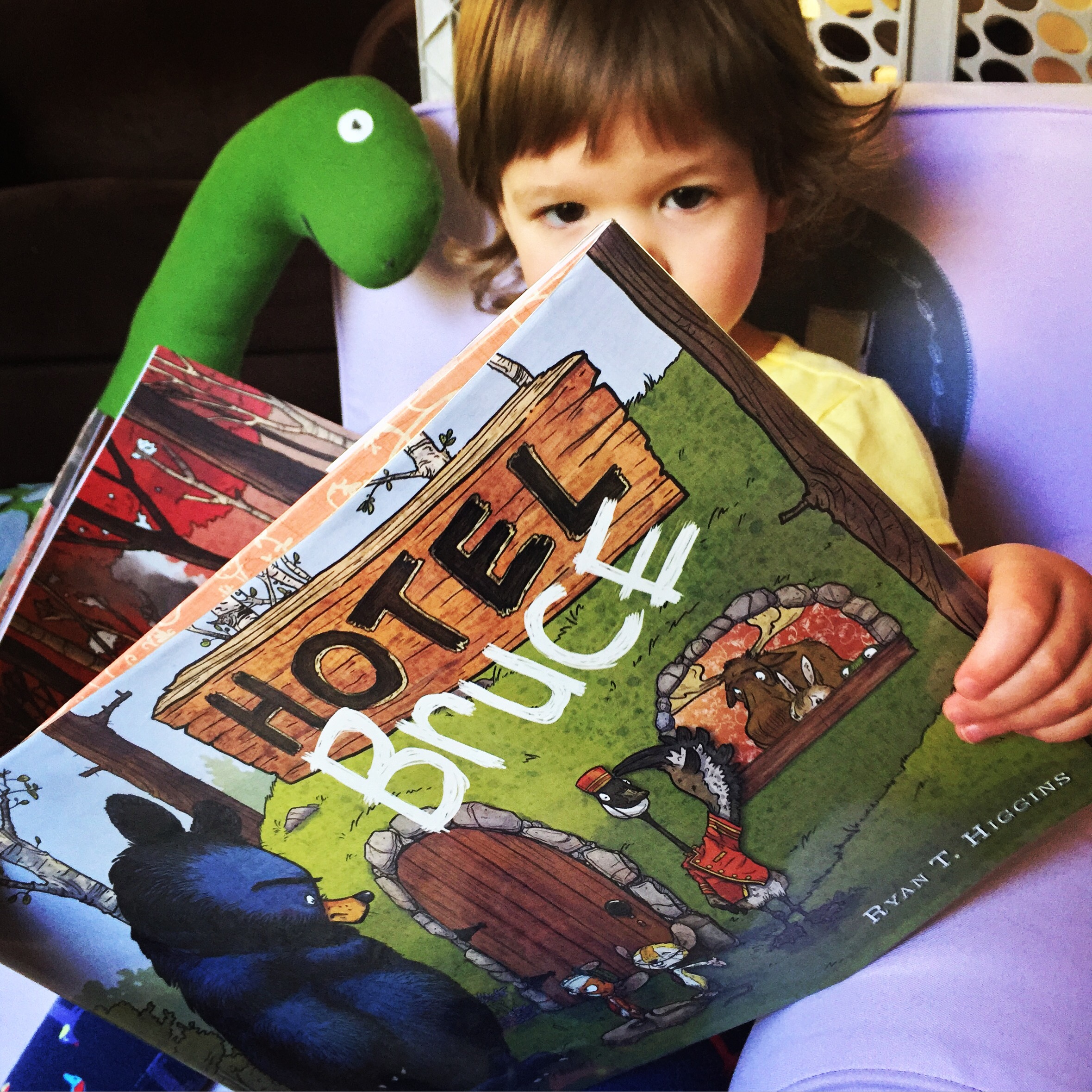 Hello, friends! Today, we read Hotel Bruce by Ryan T. Higgins, a hilarious tale of a grumpy bear and his rather unwelcome guests.