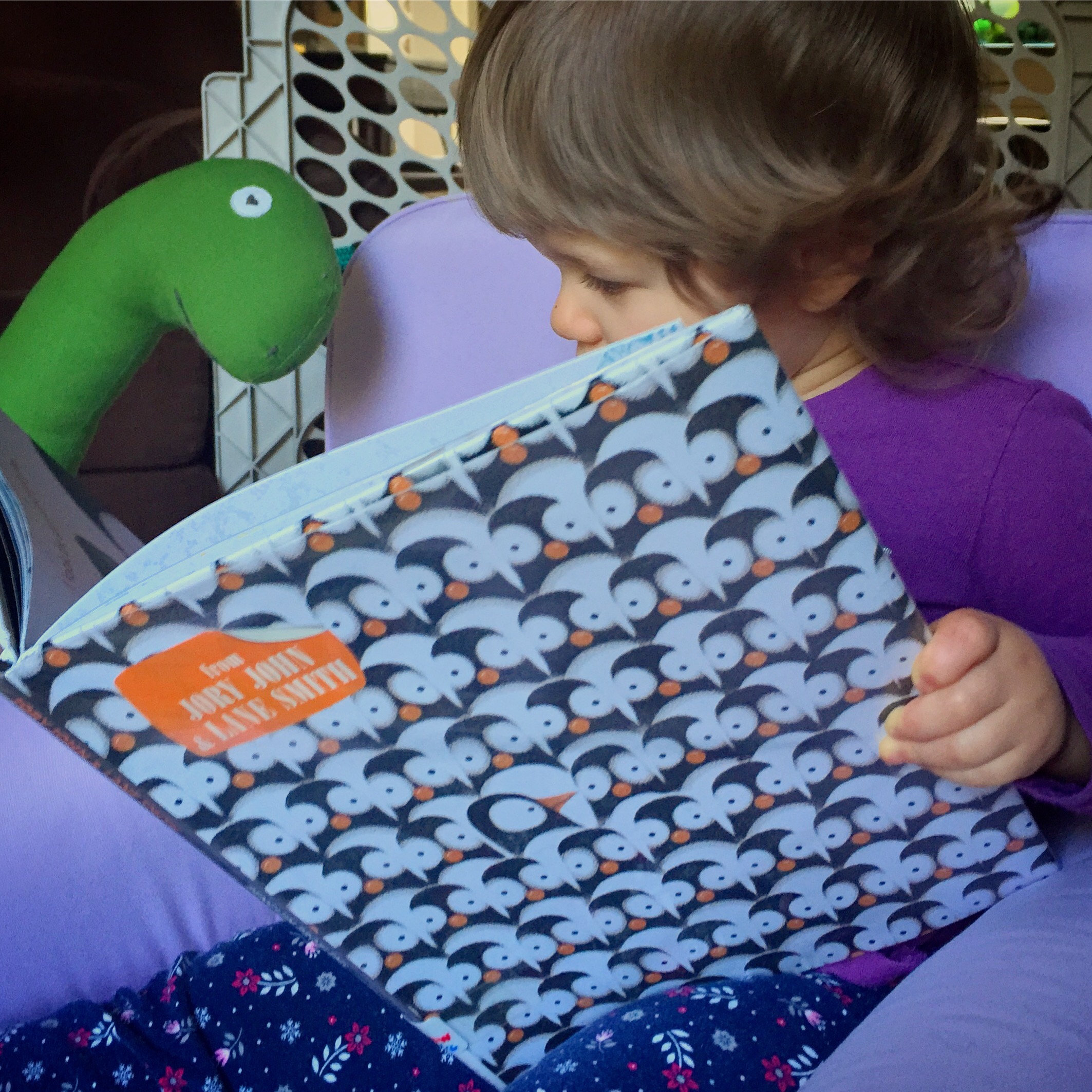 I had some mixed feelings about this one. The art is lovely, managing to take a somewhat barren landscape such as Antarctica and make it feel rich and majestic, and filling it with gorgeously illustrated creatures. Unfortunately, the story is a bit of a slog: Penguin’s whining is incessantly aggravating, and many of his complaints are simple problems that he himself can resolve but refuses to. Many other complaints are self-deprecating, which makes his sadness a bit more sympathetic, but when the pace stops dead during Walrus’ well-intentioned yet pedantic lecture, it’s hard to know who to root for. If the penguin has real self-esteem issues, “just cheer up” is not the right sentiment. And if Walrus is truly encouraging his optimism, well: Penguin immediately complains about Walrus’s interference, then begrudgingly admits that some things in his life are okay, then goes RIGHT BACK to whining. It’s a frustrating ending that leaves the reader feeling as though there has been no progress. There are some cute jokes and, again, the art is just lovely, but the pacing problems made it tough for a baby bookworm like JJ to get into, and I didn’t much like the overall message. If you’d like to peruse some charming Antarctic art, give this one a go. Otherwise, this might be one to skip.