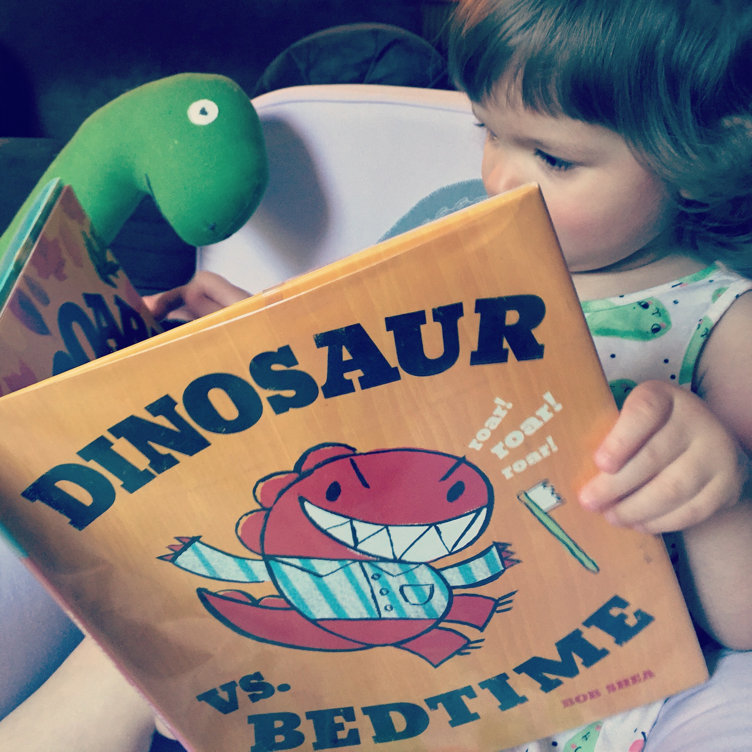 Hello, everyone! Today, we read Dinosaur Vs. Bedtime by Bob Shea, the first in the Dinosaur Vs. series. It’s a funny little book about an bold little dino and his unique way of tackling challenges.