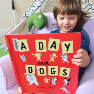 Hello, friends! Our book today is A Day With Dogs by Dorothée de Monfreid, a positively wonderful book of words, letters, numbers and animals for beginning readers.