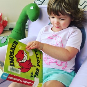 As with the previous Dinosaur Vs. books we’ve read, this one is a blast to read aloud. With more than half the dialogue consisting of various emphases on the word “Roar!”, it’s a delightfully silly story that seems tailor-made to make toddlers smile and roar along. The art is always a hoot in these as well, with the devilishly cute dinosaur and his different “opponents” set against some colorful pop-art backgrounds. The length is perfect for a quick read, and JJ adored it. And while there’s not much actual information on how to use a potty, this could be a great book to introduce the idea of potty training in a fun way. Overall, it was a lot of fun, and it’s Baby Bookworm approved!