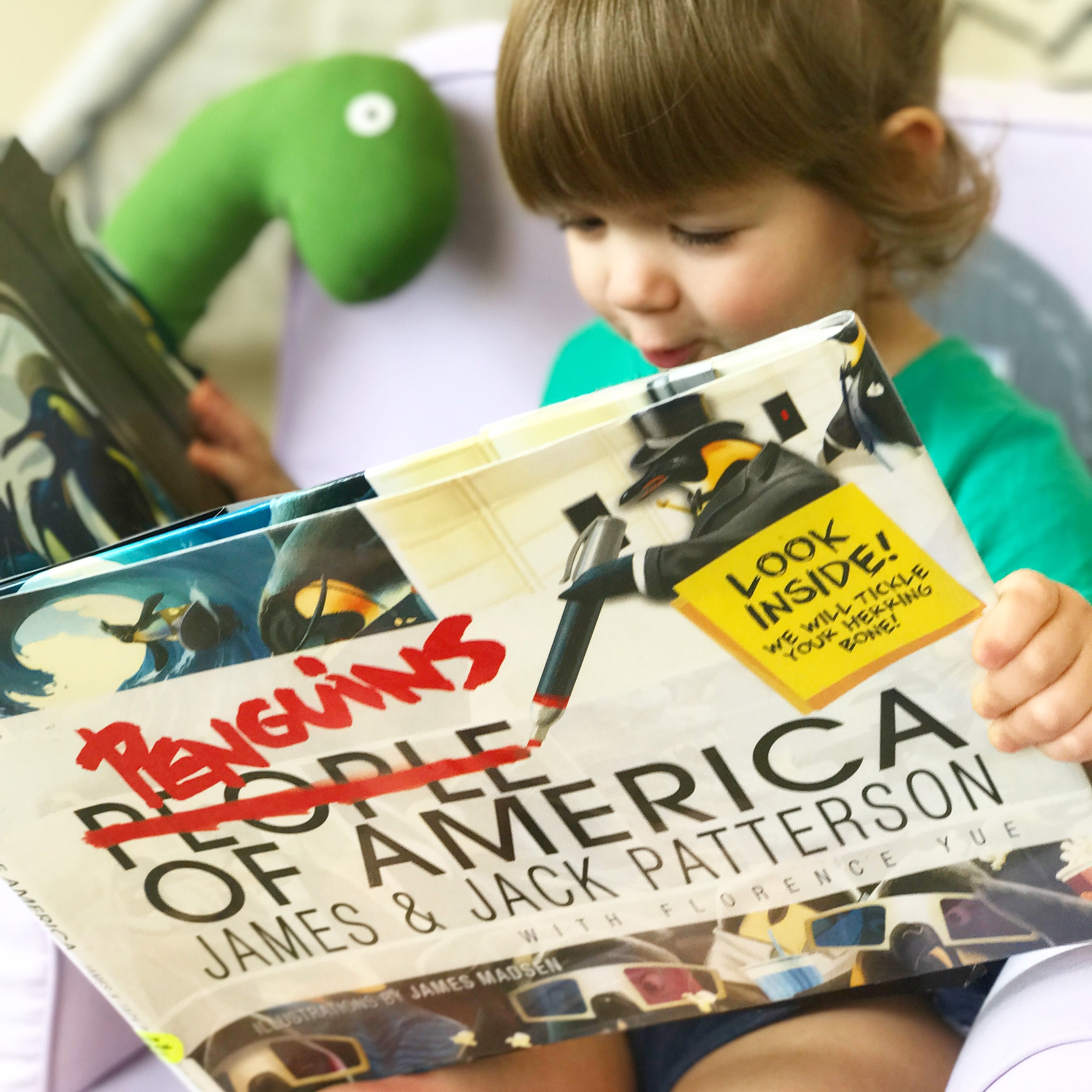Hello, friends! We have an interesting one today: Penguins Of America, written by James and Jack Patterson with Florence Yue and illustrated by James Madsen. This one is technically not a children’s book, but a coffee table/humor book (JJ grabbed it from a shelf at the library because she loves penguins, and well, this is her blog too). However, it put a big smile on her face, so we felt it was worth reviewing regardless of its intended audience.
