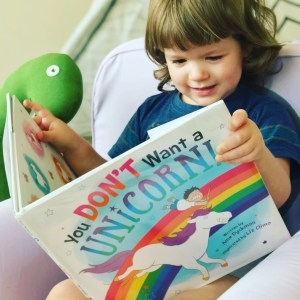 What a wonderfully silly story! Between the hilariously exasperated tone of the narrator to the colorful and absurd illustrations of the little boy and his troublesome pet, this was a bunch of fun cover to cover. I liked that they shook up the gender norm a bit and had a boy who was fanatical about unicorns (right up until the unicorn party destroys his house), and JJ and I both loved the absurdly dramatic and fun-to-read text, as well as the rainbow-rific art. The length was great, and JJ had a blast. This one will put a smile on anyone’s face, unicorn-lover or not. Baby Bookworm approved!