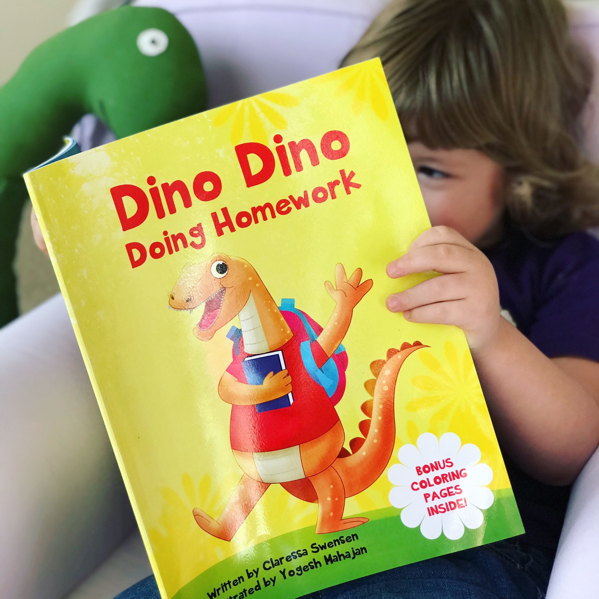 Hello, friends! Our book today is Dino Dino Doing Homework, written by Claressa Swensen and illustrated by Yogesh Mahajan, the story of a little dinosaur learning the value of doing his homework.