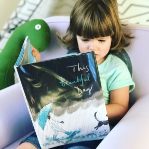 This was a sweet and fun book with a simple message, some great art, and a good deal of charm. I loved Lee’s use of watercolors to represent water and clouds, and gradual shift from grayscale to full color as the weather became brighter and clear. The message is a great one as well, showing that having a good attitude can make any day a beautiful one. The unusual rhyme scheme tripped me up a few times on first reading, but not so much that it diminished our enjoyment of the book. The length was good, and JJ enjoyed it, so we can definitely recommend this wonderful rainy day read. Baby Bookworm approved!