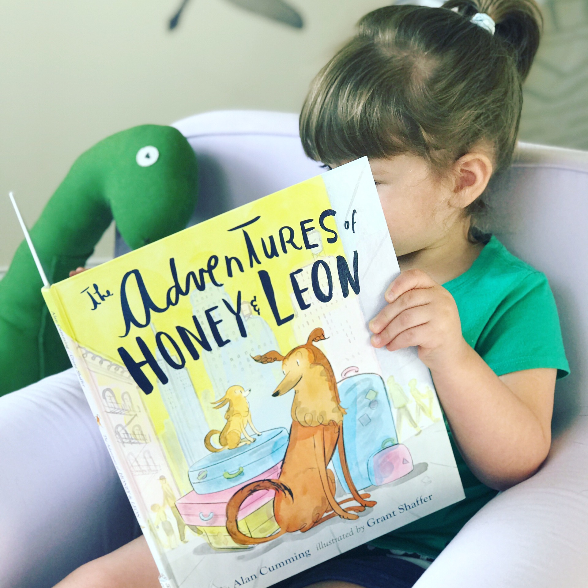 Hello, friends! Our book today is The Adventures Of Honey & Leon, written by Alan Cumming and illustrated by Grant Shaffer, a delightful tale of two clever dogs and their loyalty to their human daddies.