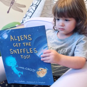 Hello, friends! Today, we’re reviewing Aliens Get The Sniffles Too! Ahhh-Choo!, written by Katy S. Duffield and illustrated by K. G. Campbell, the tale of a little alien with a nasty cold.