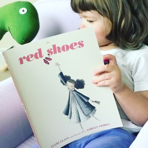 Hello, friends! Our book today is The Red Shoes, written by Eleri Glass and illustrated by Ashley Spires, a sweet story of a girl and a coveted pair of crimson shoes.