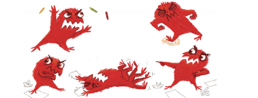 When Allie’s crayon broke during coloring time, she became – quite suddenly – and furry red ball of rage. After screaming, shouting, and letting it out-ing, the Allie-monster sheds her layer of red fur, revealing a smaller orange monster inside. From there, big brother attempts to help, giving Allie ways to deal with her anger – hugging her favorite toy as hard as she can, taking a deep breath and blowing out pretend candle, etc. Each activity helps Allie feel a little better, and shed another layer of fur: orange to green, green to blue. At last, Allie and her brother have worked to calm her feelings, and the real Allie – a regular little girl – emerges from the last monster layer, requesting a hug.