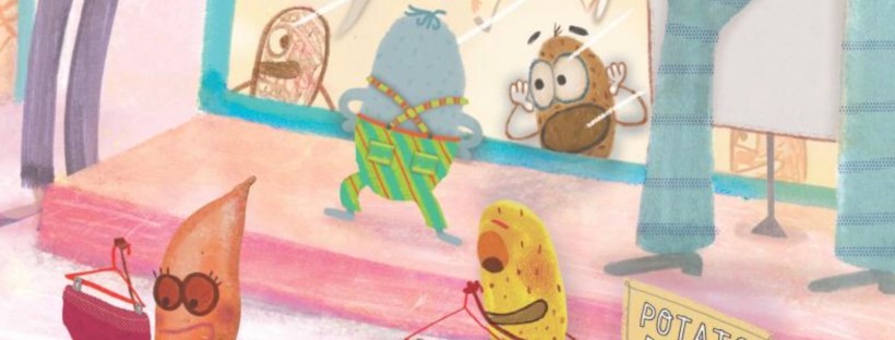 Why is this potato doing the Robot (PO-bot)? He’s excited! There’s a special fashion event down at Lance Vance’s Fancy Pants store – a Potato Pants sale! He joins the throngs of other shopping tubers, spying a pair in the window that is just his style. But when the store opens, he spots something else inside: a larger eggplant trying on pants, the very same one that rushed by him and knocked him down yesterday. Why is the eggplant there?! This is Potato Pants Day (Eggplant Pants Day was yesterday)! Hemming and hawing as the potato pants fly off the shelves, Potato waits for the eggplant to leave – fuming, wondering, checking for potato pants availability elsewhere – but the eggplant remains. At last, the last pair of pants is on the rack – will Potato risk his safety to procure the pants of his dreams?