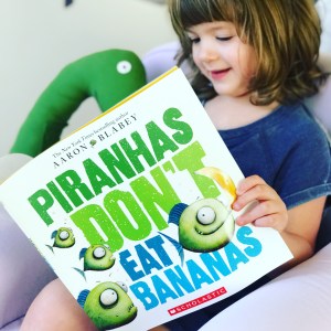 Hello, friends! Our book today is Piranhas Don’t Eat Bananas by Aaron Blabey, the delightfully silly tale of Brian, a piranha with a unique appetite.