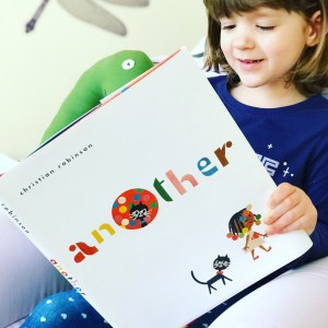 Delightfully bizarre. I love a picture book that challenges its young readers, and this one definitely inspires some creative thinking. Robinson does a great job of telling a purely visual story, playing with orientation and direction in a way that allows readers to physically become part of the story through turning the book and re-examining the art from another perspective. Even with such a strange premise, the bright colors and equally bright smile on the girl’s face clues the reader in that there’s no danger in the alternate dimension, even with a tantalizingly ambiguous ending. This one works well for all ages – younger kids will have fun with Robinson’s classic and colorful papercut-style-art, and older kids will enjoy the unique premise and the curiosity it inspires. The length is fine for everyone, and JJ loved it. A little dark, a little light, a little fun, and a little weird: a wonderfully entertaining combination. Baby Bookworm approved!