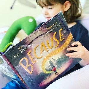 Hello, friends! Our book today is Because, written by Mo Willems and illustrated by Amber Ren, a lovely ode to the community of people that are behind a single work of art.