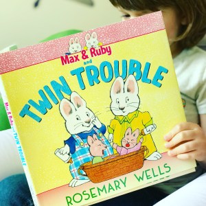 Hello, friends! Our book today is Max & Ruby And Twin Trouble by Rosemary Wells, a gentle tale of what happens when not one, but two new babies are added to the titular siblings’ lives.