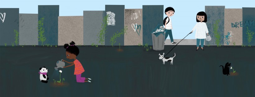 In a darkish, grayish city, where it seems everyone is rushing off to somewhere, there lived a little girl and her bear. And while other people seemed content to keep their heads down and ignore the neglected and empty spaces between the buildings, the little girl couldn’t help but imagine her city as a magical place, full of potential for things to grow and blossom. The little girl plants a dandelion seed in a can, but the can tips over and falls to the ground… yet the flower takes root in the concrete itself! Nurturing her little seedling with water, love, and even a garden party, it blooms and spreads more seeds in the empty lot. Passersby begin to notice the greening space and the little girl’s dedication to her plants, and it warms their hearts. Soon, the girl must travel away for a while, and she becomes concerned that, in her absence, the garden will suffer. So she leaves her trusty bear in charge to watch over her small blooms. And when she returns, she finds that something even bigger than her flowers have taken root…