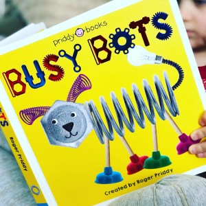 Hello, friends! Our book today is Busy Bots by Priddy Books, a sweet seek-and-find board book for young engineers.