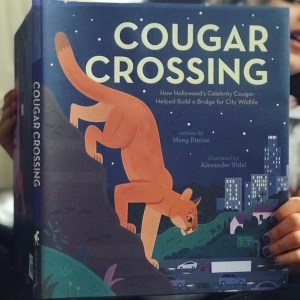 Hello, friends! Our book today is Cougar Crossing: How Hollywood’s Celebrity Cougar Helped Build a Bridge for City Wildlife, written by Meeg Pincus and illustrated by Alexander Vidal, the true story of P-22, the famous mountain lion of Los Angeles’s Griffith Park.