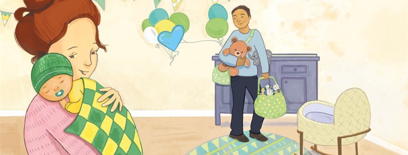 “¡Hola, bebé!” begins this adorable read, as the artwork shows a mother and father arriving home with their newborn baby. The parents address their little one directly, introducing the baby to their home, themselves, and fawning over the baby’s little carita, manitas, and deditos. After a quick meal and snuggles, bebé is swaddled for a nap – like a burrito – and wished buenas noches.