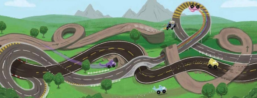 A fun ride with a sweet message. Telling a pretty straightforward tale of teamwork with bouncy yet somewhat underwhelming rhymes, it’s Cenko’s unique art elements that elevate the story to something special. For one thing, the play on words of “little monster trucks” is doubly delightful; it’s both an oxymoron and a double-meaning, as the vehicles themselves are not just monster trucks but also trucks that are monsters. What’s more, I loved that two of the trucks had distinctly “feminine” designs – it shows that interest in vehicles need not be something perceived as strictly “masculine.” The bright colors and comic book-style action sequences were exciting visually, and it enhanced the story immensely; even the endpapers, which feature the track map and stats for each car, are creative and fun. The length was great for a quick storytime, and JJ really enjoyed this one, especially the unicorn car that left a wake of rainbows. Overall, this one is an enjoyable adventure with a nice message on working together, and some great subtext on inclusion. We liked it, and it’s Baby Bookworm approved!