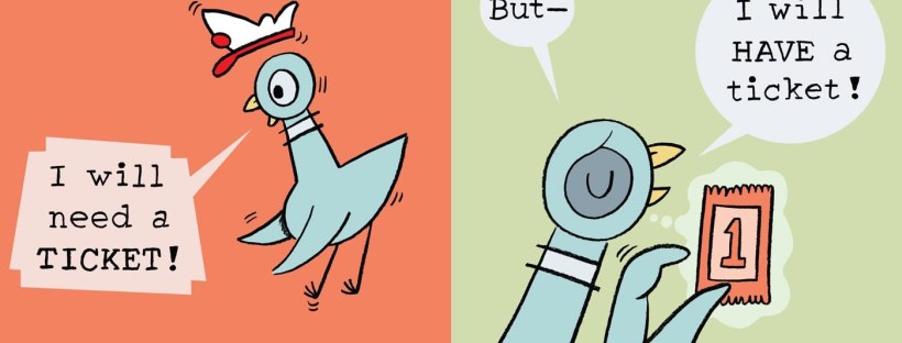 The opinionated pigeon is back and so. very. ready. to ride the roller coaster today. He knows that riding the roller coaster will NOT be easy. He will need a ticket (but he will HAVE a ticket). There will be a line, but he will “demonstrate exemplary patience!”. And when he arrives at the front of the line and it’s his turn to ride? Oh. BOY. He will experience an inimitable topsy-turvy adventure like no one has ever seen! He will be EXCITED, and DIZZY, and PROUD, and he will be ready to do it all over again! Before he knows it, he is to the front of the line! He has his ticket! You know what comes next! Or do you?