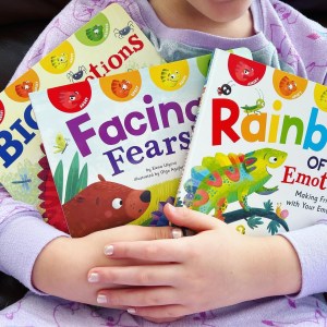 Cam the chameleon, like everyone, feels lots of different emotions, yet Cam is unique in that he literally wears his feelings on his face; his scales change to a specific color depending on the emotion he is currently feeling (yellow for happy, purple for embarrassed, white for scared, etc). In each book, Cam is faced with a different dilemma – looking for a playmate, finding his mom, and being confronted with xenophobia – and navigates through his full range of emotions before reaching a conclusion. After the plot is wrapped up, the final page encourages readers to think about how they deal with their own emotions.