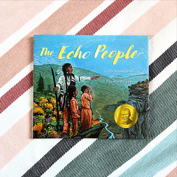 The Echo People, written by SD Youngwolf and illustrated by Shonto Begay, is the tale of cousins Aiyanna and Little Wolf, who are preparing to journey with their Grandfather to meet the Echo People, a mysterious group who live in the nearby river gorge. While the Echo People cannot be seen, they can call back to those who shout their greetings and, as Aiyanna and Little Wolf soon find, often act as a reflection of the attitudes and emotions they are greeted with.