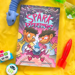 Naturally, that makes it a great time to highlight some STEM books for kiddos! One of our upcoming favs is The Spark Experiment by Matthew K. Manning and Matthew Loux, a middle grade graphic novel that blends fiction and nonfiction for plenty of STEM exploration. Following young neighbors David and Marta as they attempt to rescue David’s mom from the Micro Universe, chapters are interspersed with 18 real-life DIY experiments that readers can try for themselves, letting them spark their own imagination and creativity!